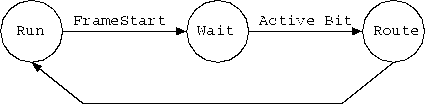 This part of the chip detects an active bit from any of the inputs and enables the arbiter. It has 3 states (see figure 2) Run, Wait and Route. A frame start signal moves it from Run to Wait and an active bit from any slot moves it from Wait to Route. Any condition then moves the state machine back to Run. It remains in the `Route' state for just one cycle which triggers the arbitration unit.