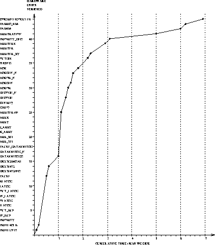 Approximately two man-months were spent performing the verification. The breakdown of the time is given in Figure 1. It shows the cumulative time taken as each module was verified. The time (one week) spent proving general word theorems is not included. On the whole, the simpler modules were verified first. The verifier had not previously performed a hardware verification though was a competent HOL user.
