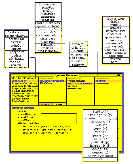 System browsers inhabit a window with five panes. The four upper ones are used for navigating a "path" through a space of definitions, while the lower one views the selected definition itself. To provide some structure to the large number of classes which can be found in a typical Smalltalk system all classes are grouped into categories. First we must enter a class category, which causes a scrollable list of classes categorized under that label to appear in the pane to the right. Choosing a class from this list narrows the browser's focus to all of its methods, which are now accessible for inspection. At this stage we must also decide whether we want to view class or instance methods. Methods are categorized in the same way as classes, and we must now choose a category. This finally returns a list of methods, which may now be selected - after which the relevant code is shown in the lower pane. Each of the five panes has its own "yellow" button menu, offering various options, as shown below. The options contained in the menu for the bottom pane could now be applied to all or any selected part of that code.