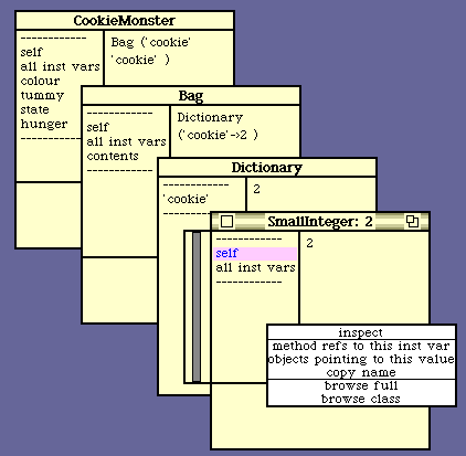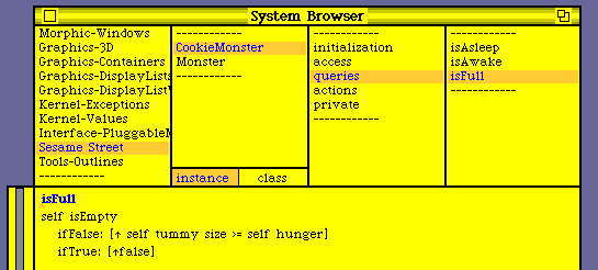 The nag method shown in the bottom part of the browser in our final figure contains a whileTrue: loop, which is guarded by a test on the cookie monster's state. Within this loop it repeatedly asks for a 'cookie'. If one is offered, it is eaten. Any other item will be refused. This cycle will only terminate once the monster is "full", whereupon it falls asleep. The fourth browser pane's menu now allows us to browse all senders, all implementors, as well all references to class and instance variables. This functionality can often be very useful; for example, if changes to the method header should necessitate modification of messages sent somewhere else in the system, then it is easy to locate all these places .