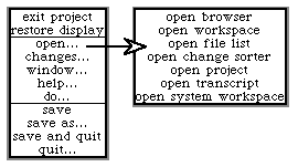 The Smalltalk environment uses "pop up" menus in place of the "pull down" menus popularized by the Apple MacIntosh user interface. These have the advantage that they may be invoked at any place on the screen and are therefore more suitable for large display surfaces . A menu for selecting the "top level" functionality of the system is framed whenever the mouse button is pushed over an empty area of the screen . All menu items suffixed by "..." have suboptions, e.g. choosing "open" will offer a number of alternatives: