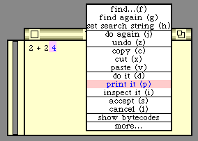 Workspaces permit expressions to be evaluated, in the way shown below. The relevant expressions should be selected by using the "select" button, and the "execute" menu may be invoked from within the workspace (as shown). This menu provides, among other options, two operations to trigger evaluation: doIt will send messages to the objects involved, while printIt will also show the returned value. As in Lisp all Smalltalk code must return some value. If not otherwise specified this will be the receiver of the last message. Here we send the message "+" , with an argument of '2', to the number '2'. The resulting value is highlighted in reverse video.