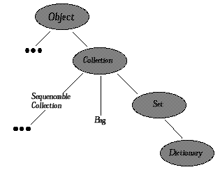 Object is the root of Smalltalk's inheritance hierarchy , providing some basic functionality to all objects. Class Collection is among class Object's many subclasses, and may itself be further specialized into a whole range of data structures. Sets are just one of these, with Dictionaries as a subclass. Dictionaries are used to store associations between pairs of objects. The code below shows the use of these data structures in a simple example. First a dictionary is defined, associating some old friends with a selection of virtues. Messages are then sent to this object, listing and searching for keys .