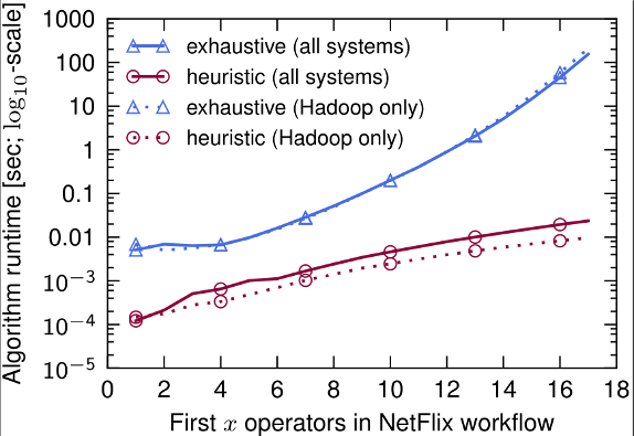 The input consists of an extended version of the Netflix workflow. On the x-axis we vary the number of operators we include from the workflow. The exhaustive search algorithm runs in under a second for workflows of up to 13 operators. While it guarantees that the optimal partitioning with regards to the cost function is found, the runtime of exhaustive search quickly becomes impractible (e.g., 154s for the workflow with 17 operators).