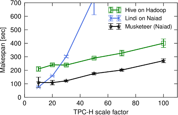 experiments/plotting_scripts$ python plot_tpch.py ../tpch/tpc-h-q17_new.csv hive "Hive on Hadoop" naiad_100nodes_baseline "Lindi on Naiad" naiad_musketeer_merged_c4 "Musketeer (Naiad)"