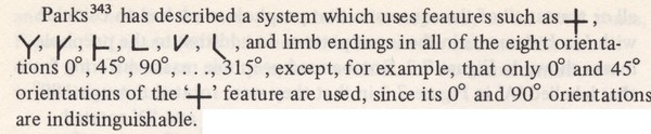 A program in DBTL would read in a file containing digitised characters and perform a sequence of tests on each character to try to identify it. A file of the results for each character identification attempt would be printed. DBTL was an if-then-else language for writing decision trees. The tests at the nodes of the trees checked for features due to Parks like those shown in the extract from page 174 of Ullman’s book below.