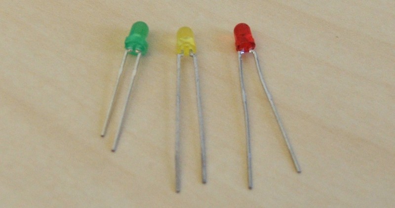 An LED is a very simple electronics component which lights up when electricity flows through it. Since it is a diode, electricity can only flow one way. There is usually a flat section on the side of the LED to mark its polarity: this side should be connected to ground. This side usually also has a shorter “leg”.