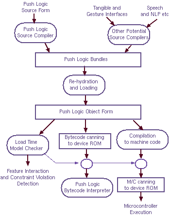Active Tuple Computing is a model of computation where code is contained in the Tuples. With Pushlogic, we operate on Passive Tuples: no running code is held inside Tuples and Pushlogic is not intended to be a process algebra. Pushlogic is defined to operate in a 'domain of participation'. Pushlogic rules are stored in bundles and must be re-hydrated and checked before loading into a domain. Re-hydrating provides binding of field names to new objects that have entered the domain. Checking consists of model checking a number of constraints. If checking fails, the bundle is not loaded. In the future, a pair of domains can be merged provided automated checks are successful. This would be useful for mobile domains, such as a train carriage. Tool FlowPushlogic is defined at a bytecode object level and at a block-structured HLL source level. ![]() The source level gives the illusion of having threads and other features commonly found in imperative languages. It is compiled into object-level bytecode. Bundles of bytecode may be stored in various sorts of file system. Bundles may be re-hydrated before being executed. Re-hydration involves rewriting field names in the bundle to refer to specific fields in the target environment. Typically, when a new device enters the environment, a copy of its associated bytecode needs re-hydrating for that environment. Before execution, a number of constraints are checked and the levels of fields already present in the environment may need to be pushed down (lowered) to provide sufficient height for the new code. If either the constraints or level setting fails, the bundle is not loaded. For instance, the bundle might be incompatible with an existing bundle. As an alternative to re-hydration, a Pushlogic program may be stored in the ROM of an embedded device (canned), or even compiled to machine code for an embedded controller. In these cases, the program achieves binding by using tuple references that are local to the current device root. Reliable Scripting Project FlowWe have recently applied for funding for study in the area of Reliable Scripting. The architecture envissaged is shown in more detail in this figure. Pushlogic is a strawman that conforms to this flow. However, the use of existing, general purpose languages can also be explored in this framework. |