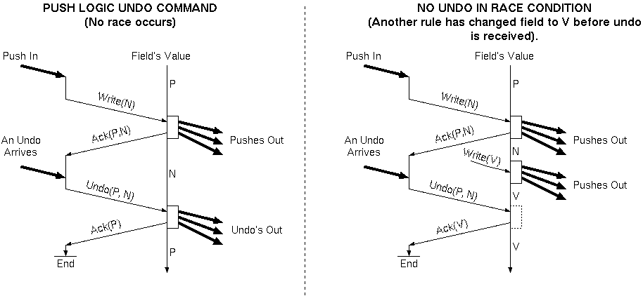 Pushlogic is our name for a style of error-resilient programming that operates on Passive Tuples. In Pushlogic Object Code, everything is declarative and no unbounded looping constructs are allowed, except where the loop passes through a device with known minimum delay, such as a timer. In Simple Pushlogic, no tuple creation, list operations or other dynamic storage allocation is allowed, instead these facilities are provided by a special loader process. Pushlogic Source is a high-level language that compiles to Pushlogic Object Code. Push Logic is suitable for implementing the embedded applications in many ubiquitous devices, with small fixed memories, such as a DVD player or burglar alarm. It is also suitable for safe control of a domain of sensors and actuators with dynamic membership both in terms of device population and the number of controlling applications. This research investigates the boundaries between synchronous and asynchronous notification and between declarative and imperative programming. The first boundary is investigated in that both styles of commanding can be freely mixed in a common language. The second boundary is investigated in that all programs are coded in a declarative style with no unbounded loops, but operate on fields of tuples using imperative assignments. High Level and RuntimeThe runtime system for Pushlogic is designed to be used with other high-level languages apart from Pushlogic source code. Pushlogic Source has a somewhat novel error recovery procedure. We wish to also explore what can be done using other HLLs that can generate our declarative object form. OverviewThere are many forms of declarative logic programming languages. One distinction between them is whether the underlying execution engine must perform hyperlinear searching in order to find the first solution. Pushlogic is a logic programming language where the response to any data value change can be found in time that is proportional only to network delays and the number of rules stored. We call it push logic for a number of reasons: