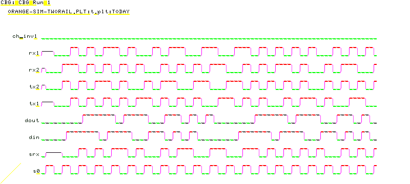Here is a simulation run generated when the channel is not crossed or inverted ![]() Here is a simulation run generated when it is crossed and half inverted ![]() The nets marked prb are a prbs generator used in the testbench to create some stimulus for din. The circuit generated by a run of the tool on this specification has been drawn out by hand for the white paper. Another ExamplePlease see GPIB to Centronix Example. |