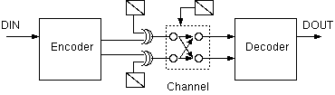 Output from the compilationThe following circuit was generated by chaff. Looking at this carefully, we can see it has chosen to alternate tx1 on every baud interval and to NRZI encode the data on tx2. However, cleverly, the receiver is insensitive to the interchange of tx1 and tx2. We also see that it did not chose to use the available transmitter buried state bit s0.