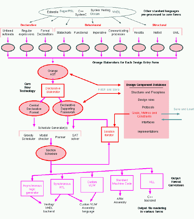 The project flow converts a wide number of input forms into a common, central declarative format. We certainly have not got as far as implementing all the forms shown on the diagram. Instead we are concentrating on our own languages, H1/H2. Whatever input form is used, everything is processed in small sections that consist of schedules of lower-level sections or atomic data operations. Ancilliary information from the input form is also retained in a `supporting framework' that enables, if desired, more or less the same output code to be generated from given input code, despite it being converted via the central declarative form. The declarative form of a given section is converted to an implementation using one of a variety of avaliable engines, from a basic greedy algorithm to an efficient model checker. There are many possible solutions in general, and although certain constraints are best fed into the engine as declarations, other contraints are best handled as evaluators of the generated design, so that an iteration can be made as needed. The output is a schedule, which is an allocation of resources to time-slots over a finite time horizon. Since we are only designing `eternal' systems (i.e. hardware or embedded firmware) then each schedule repeats infinitely in the final implementation. A solution iterator and an expert system can act out-of-band to influence the quality of the result. They are `out-of-band' in the sense that if they make an error they cannot alter the correctness of the result. Partial designs and all other structural information are held in a central database. The project currently assumes that all structure is generated by the user, but that when components are composed, the tool may disolve the boundaries. Project ComponentsAs well as using input from .net CIL bytecode, two experimental input languages have been developed: