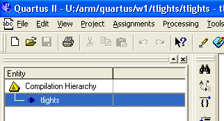 Notice that a hierarchy window has opened containing an entry named tlights - this represents the Verilog source file. Double click it to open the file in an editor.