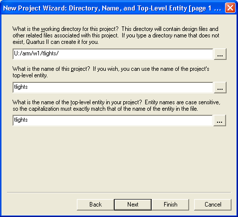You should now open the Quartus II program from the Start menu (it's in Teaching Packages | Computer Laboratory and called Quartus 4.0 on the PWF). Start by creating new project using File | New Project Wizard . At each step enter these settings: