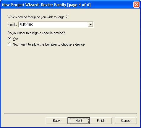 The type of chip designated to a design can be viewed using the Assignments | Device dialog. This should be correct already, but it is as well to check. We will be using an EPF10K20RC240-4. The box should look like this: