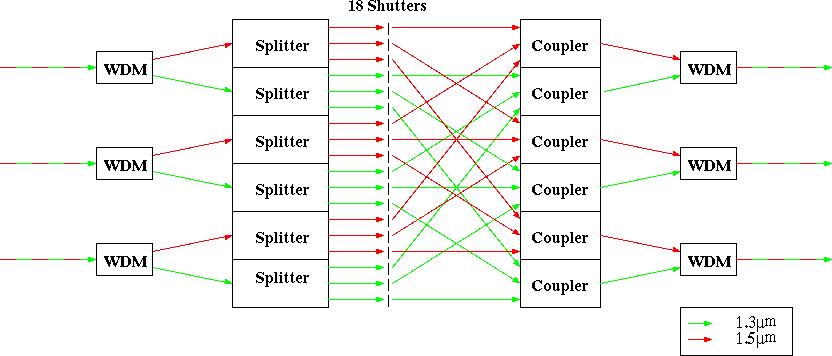 Each of the six fibres (3 in, 3 out) which connect to the switch are split in the same way, making a total of 36 fibre ends. These fibre ends are interconnected with 18 optical shutters arranged as two 3x3 crossbars, one for each wavelength.