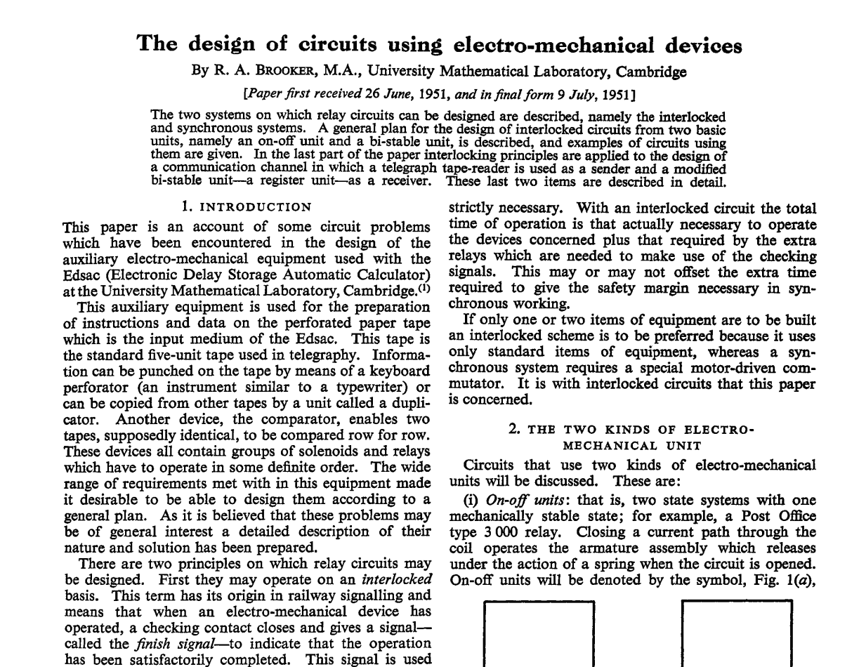 Even in Cambridge, Electromechanical circuits were commonly used in support of auxiliary equipment for computers, although not for the department's famous computers themselves.