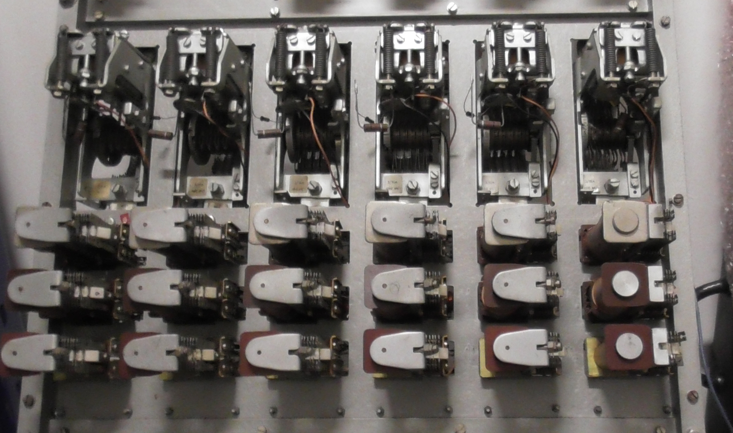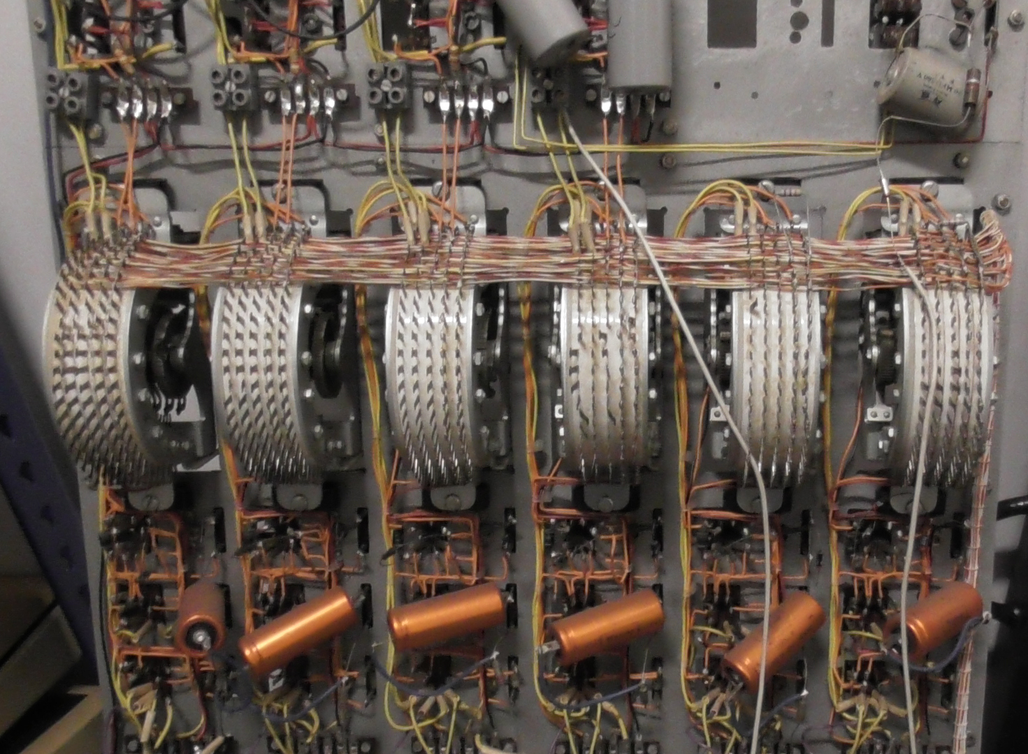 The central part has 12 similar units, arranged in two rows of six, each with a uniselector and three relays. Each of the 12 units implements a port for the larger axis. Each port has a uniselector and a controller consisting of 3 relays and a 100 uF capacitor with a few diodes and resistors.