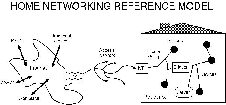 Device and World Modelling PlaneThe modelling plane allows a device or other entity to describe itself and for names and other information to be allocated and associated with an entity. A device may be something like a CD player. Other entities might be people, recordings, radio channels, e-cash accounts and so on. In semantic terms, a heirarchic description of devices is used, but a flat XML syntax is used. A heirarchic description allows a device to describe itself as a composition of smaller devices. For instance, a TV set can consist of the following items: a colour screen, a UHF RF front end, a stereo audio amplifier, a NiCAM decoder, a teletext decoder and an infra-red receiver. The detailed specifications of these components can then be described in turn. Note that a TV set which supports closed captioning and graphical readout of control settings may include at least one frame store, which is a component that it would be useful to have access to over the network. A TV set which supports picture-in-picture or MPEG decoding will have multiple instances and varients of several of the components. Home Networking Reference Model |