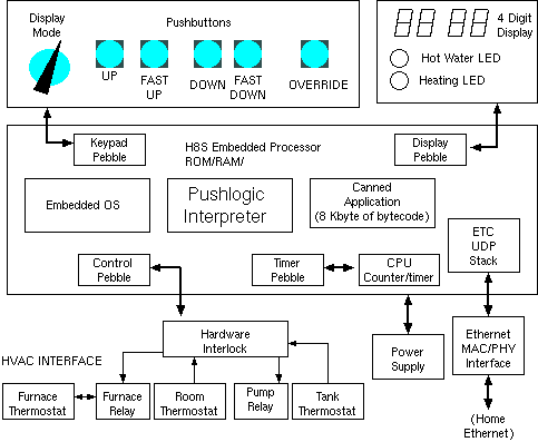 The Heating Controller consists of a Pebbles Project Molly that is running the Tuplecore substrate and a Pushlogic interpreter. The physical components of the Heating Controller are:
