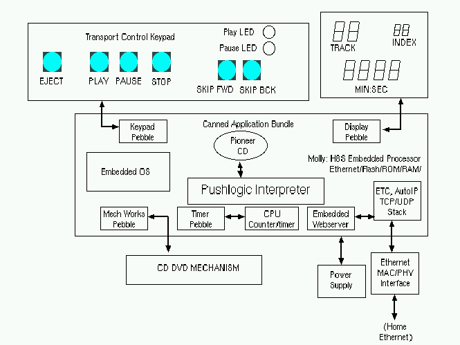 ![]() AbstractThe Pebbles project has made a CD/DVD player where the internal state variables are implemented with tuplecore, the Embedded Tuple Core. The player can play audio tracks via the back panel RCA connectors or as streaming media over the network. The internal application software is implemented using Pushlogic. The player was made using the control panel and power supplies from a commercial CD/DVD player, with the processor card being replaced with our own Molly card. CD PLayer Software StructureThe software is logically partitioned into separate components, each of which separately registers as a field in the "$#parts" tuple. The components are: