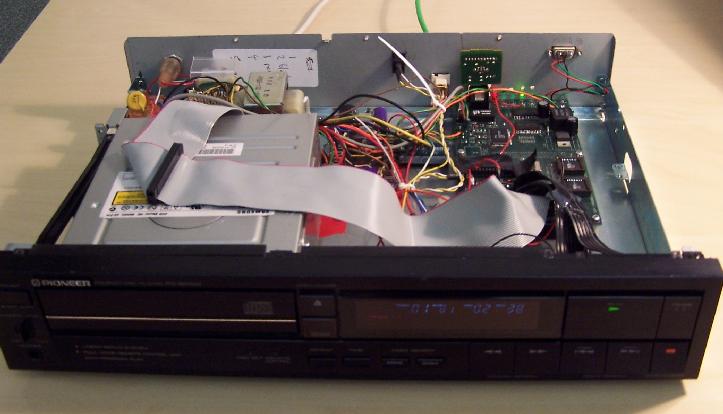More interesting applicationTo make the application a bit more interesting, and to take into account that we have a pair of heterogeneous CD players, we extend the application so that it is possible to display and control one CD player from the other. The application that controls one CD player from the other can be run equally well on either CD player or on a separate execution platform. The final, complete Pushlogic code is to be inserted here. Under construction. Hardware ImplementationPrototype top view, showing internal Molly card. ![]() |