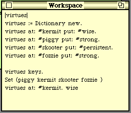 Object is the root of Smalltalk's inheritance hierarchy , providing some basic functionality to all objects. Class Collection is among class Object's many subclasses, and may itself be further specialized into a whole range of data structures. Sets are just one of these, with Dictionaries as a subclass. Dictionaries are used to store associations between pairs of objects. The code below shows the use of these data structures in a simple example. First a dictionary is defined, associating some old friends with a selection of virtues. Messages are then sent to this object, listing and searching for keys .