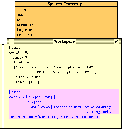 The workspace above shows 2 examples of how blocks are commonly used. The first case is a simple test, streaming over a range of numbers inside a loop. If a number is even, 'EVEN' is shown in the Transcript, and if it is odd, then 'ODD' should be printed there. Here we restrict our count to three, so that 0,1 and 2 will be tested. The task can be accomplished using a combination of whileTrue: and if..: messages. The thing to note is that both the receiver and argument must be blocks in the case of the whileTrue: structure, while only the argument must be a block in the case of ifTrue: and ifFalse: . The second example processes a list of symbols. A block describing appropriate actions is first constructed and named "canon". Here it should be noted that colons are used to prefix the names of the two block arguments, which are separated from the block body by a vertical bar. Any temporaries, if required , would follow after this. This block can now be executed as many times as desired, given different values as arguments . In our example the value:value: message forces evaluation for a three-voice chorus of dubious quality .