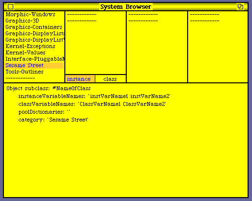 Classes can be defined once the new category has been added to the system. For this purpose the lower browser pane will show a template for class definition, which the user may fill with detail. Choosing "accept" from the menu compiles the definition and adds it to the dictionary of classes the system knows about). NOte that choosing "update" from the leftmost browser pane's yellow button menu may sometimes be needed to force a browser to show the most recent changes.