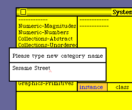 To implement this scenario in Squeak we must first make a new class category, SesameStreet, add the Monster and CookieMonster classes, and then define and test all the methods. All these actions can be performed from within a browser, while workspaces and a new type of view, called inspector, may be employed for testing purposes. Figure 3.15 shows how to add a new class category (i.e. by choosing "add item" from the leftmost browser pane's yellow button menu and entering a string into a query box which opens in response.
