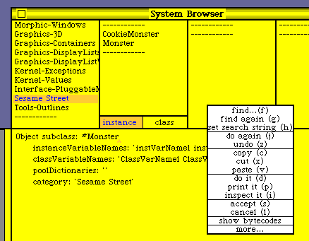 System browsers inhabit a window with five panes. The four upper ones are used for navigating a "path" through a space of definitions, while the lower one views the selected definition itself. To provide some structure to the large number of classes which can be found in a typical Smalltalk system all classes are grouped into categories. First we must enter a class category, which causes a scrollable list of classes categorized under that label to appear in the pane to the right. Choosing a class from this list narrows the browser's focus to all of its methods, which are now accessible for inspection. At this stage we must also decide whether we want to view class or instance methods. Methods are categorized in the same way as classes, and we must now choose a category. This finally returns a list of methods, which may now be selected - after which the relevant code is shown in the lower pane. Each of the five panes has its own "yellow" button menu, offering various options, as shown below. The options contained in the menu for the bottom pane could now be applied to all or any selected part of that code.