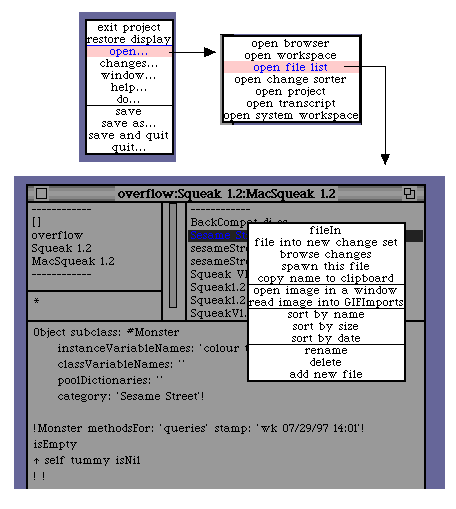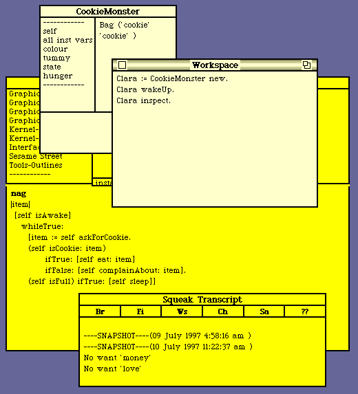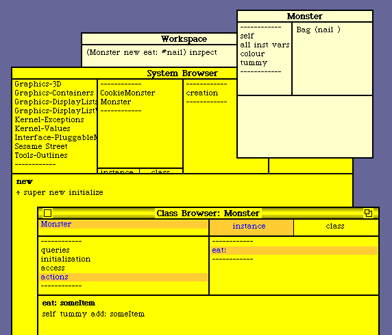 The next figure demonstrates the possibility of using more than a single browser simultaneously. In fact, the number of views on the desktop is limited only by the available memory. Multiple browsers are often useful to view different aspects of code at the same time, eliminating the need for constantly scrolling back and forth. By cutting and pasting, information may also be transferred between views. The first browser in the figure views the creation class methods currently defined for Monster. We need to override Object's standard instance creation method in order to make sure that our monsters' tummy and colour are initialized appropriately. Note the up-arrow symbol ("^") which indicates that the newly made monster will be returned as the value produced by this method. super is one of two so called "pseudo variables" (the other is self), which provide handles to the currently executing object (via self) and the message protocol of its superclass (via super). "^ super new initialize" will therefore send new to class Monster, followed by message initialize to the newly made monster , and will then return this instance in generic monster colour (i.e. green :) and with an empty bag as its tummy. The second browser is a so called class browser, which can be obtained by choosing "browse class" from the menu options accessible from the system browser's class pane. Class browsers restrict their perspective to the protocols of a selected class (here the class Monster) and their yellow button menus are the same as those of the corresponding panes of the system browser. The eat: method shown in this browser obtains a reference to the monster's tummy and stuffs some item into it. Since Smalltalk is a "dynamically typed" language one should take care to document clearly what kinds of objects a method expects as its arguments. Good Smalltalk style uses typenames prefixed by "a" or "some" (e.g. "anInteger", "someMonster") for this purpose, instead of less descriptive identifiers such as "x", "y" or "fred". This convention for naming arguments uses the name of the most general class of those objects a method is willing to accept. If we don't want to make any assumptions we can use : "someObject" or "someItem". Although it is only a convention and Smalltalk does not enforce it, the scheme serves well to simulate the documentation aspects of a "hierarchical" type system .