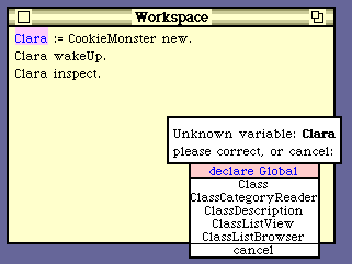 We now proceed to complete the cookie monster's definition. Taking a shortcut we will not trace the whole process in detail, but will rather look at the state of the system at the time the CookieMonster's "top level" behaviour is tested. In a real application it would have been better to test each method as it was written, but space limitations prevent us from demonstrating this approach. The figure below shows an appropriate script, in response to which a notifier has just popped up, querying our usage of "Clara". Since this is not a global identifier known to the system it asks for guidance on how to interpret it . Since it should function as a new global instance of class CookieMonster we confirm the relevant option.