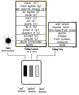 The so called "red" button is used to select information, while the "yellow" button invokes menus for manipulating a view's contents. Finally, the "blue" button menu offers a number of transformations on windows themselves (i.e. move, resize, relabel, ...). While the "blue" button choices are fixed, the specific contents of menus associated with the "yellow" mouse button depends on the cursor's position within a view and is defined by the viewed application.