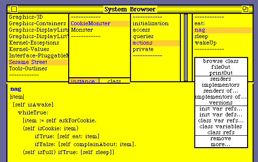 The nag method shown in the bottom part of the browser in our final figure contains a whileTrue: loop, which is guarded by a test on the cookie monster's state. Within this loop it repeatedly asks for a 'cookie'. If one is offered, it is eaten. Any other item will be refused. This cycle will only terminate once the monster is "full", whereupon it falls asleep. The fourth browser pane's menu now allows us to browse all senders, all implementors, as well all references to class and instance variables. This functionality can often be very useful; for example, if changes to the method header should necessitate modification of messages sent somewhere else in the system, then it is easy to locate all these places .