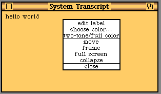 Workspaces offer a view of some piece of text. They are associated with a MacIntosh-like cut and paste editor and are often employed as a temporary "scratchpad", to enter and evaluate expressions during the process of testing new method definitions. In this case the window's body is just an area for entering text. As with any Squeak window, whenever the mouse is over the left-hand window border it will loose its "select" function and invoke a "red button" menu instead , offering a selection of choices for manipulating the view (see the "yellow button" menu above). Many Smalltalk views open into an information space of which only a part can be shown in a window, and they therefore have scrollbars to explore it further. Squeak's scrollbars appear at the left of a view and will open only when the mouse is inside it. The scrollbar attached to the workspace below indicates that there is currently no information hidden from view. If this were the case the black bar would turn to a rectangle which can be "grabbed" by the mouse and moved up and down to show hidden parts of the information.