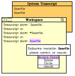 The last expression shows that elements in arrays need not be of the same type, since the array we use there contains 1 symbolic constant, 2 strings and a number. The effect of the # character is similar to Lisp's quote operator in that it inhibits evaluation of the symbols it is prefixed to. Below our mention of Snarfle causes an "undeclared identifier" response, with a menu of possible options to resolve this situation, while the previous uses of 'Snarfle' and #Snarfle simply referred to the string and the symbol itself. When viewing this figure it should be apparent that show: and cr messages sent to a text collector object (here the Transcript) cause a display of their arguments and carriage returns.