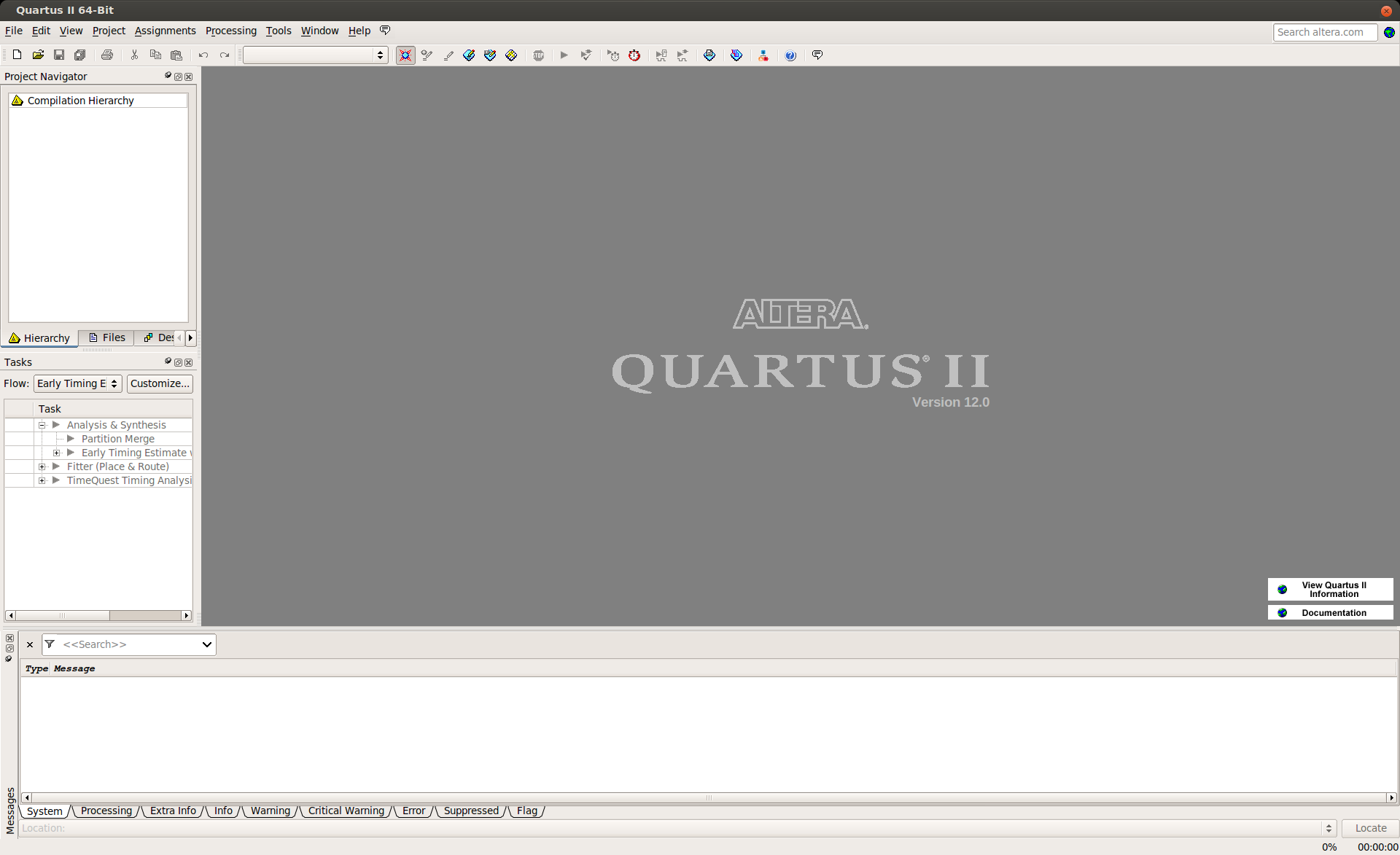 Once Quartus has started, it should ressemble the screenshot to the right. At the bottom is the Messages pane, which displays compilation messages and warnings; this may be useful when trying to debug your project. On the left is the Project Navigator, the first tab shows the logical hierarchy of the project. Below this the Tasks pane shows the state of compilation.