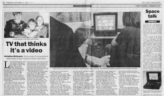 The Cambridge Digital Interactive Television (iTV) Trial started in September 1994, with ten users connected in the first phase. ATM networking technology was employed throughout the system, with two-way digital data being carried alongside cable TV signals over fibre optic links. In phase two, begun in March 1995, the network and the content server facilities were substantially enhanced, and the number of user sites (homes, schools and businesses) was increased: by January 1996 it approached one hundred.