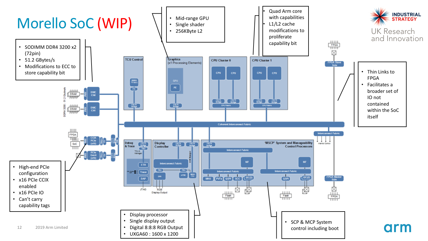 Morello will be based on Arm's existing Neoverse N1 platform and CPU; this is roughly an Arm A76 with an enhanced server-class memory subsystem. Richard Grisenthwaite (Arm)'s talk at the 29 September 2019 ISCF DSbD Collaborators' Workshop included the following work-in-progress Morello SoC block diagram: